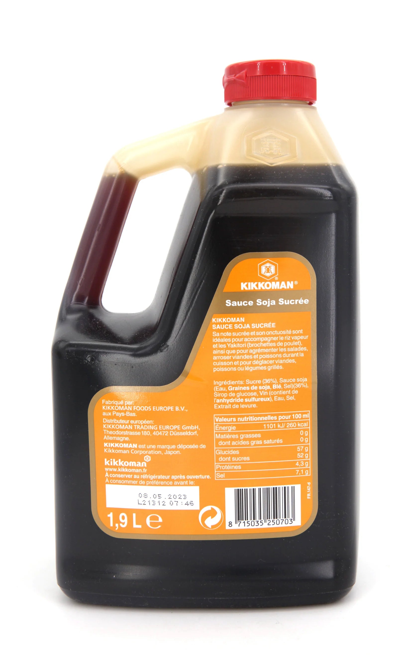 Ingrédients : sucre 36%, sauce soja 36% (eau; graines de soja, blé, sel); sirop de glucose; vin (contient de l'anhydre de sulfureux), eau, sel, extrait de levure.